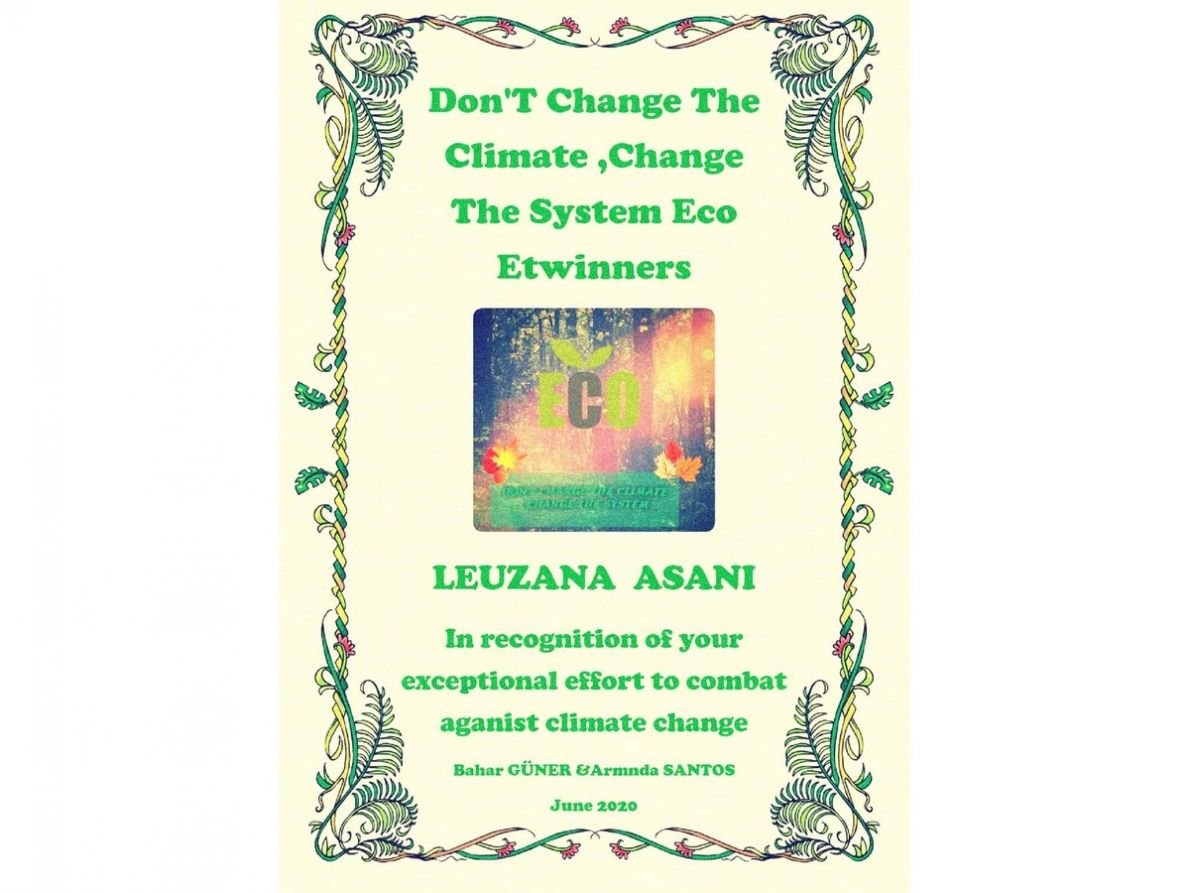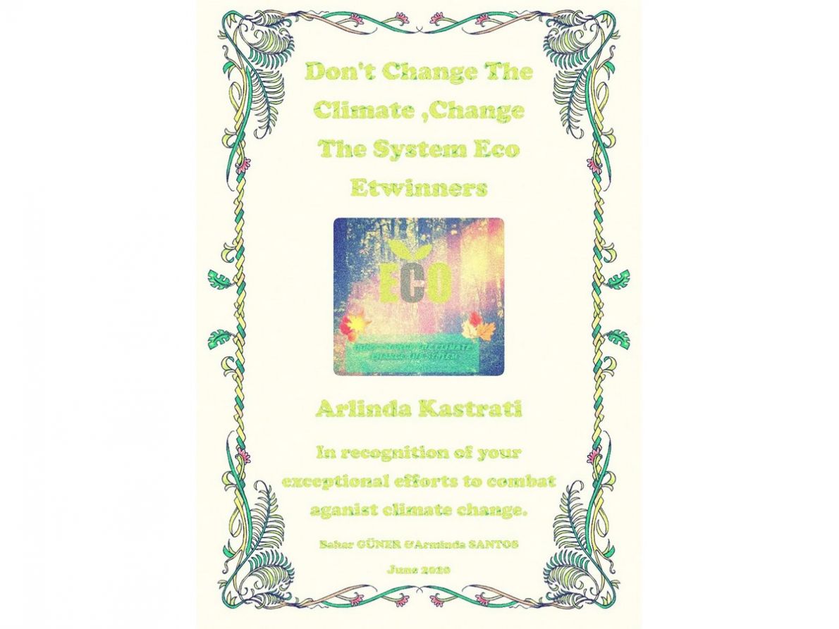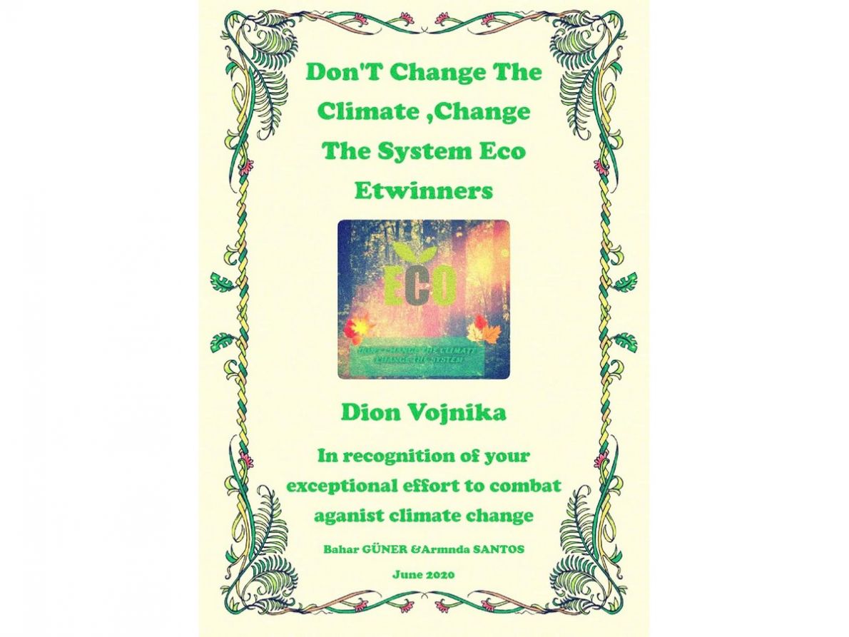Thanks to the students of the Primary school "25 Maj" - Skopje, Republic of North Macedonia for their contribution in the Etwinning project "Don't change the system, change the climate". Students of the primary school "25 Maj" successfully participated in all the project activities together with the students from Turkey, Spain, Portugal, Greece, Italy, Bulgaria. At the end of the project we are proud to deliver the following certificates to the coordinators and the students upon the successful accomplishment of the Ewtinning project "Don't change the climate, change the system!", coordinated by prof. Arlinda Kastrati and the teachers Suzana Kurbadovik, Teuta Haskaj Vojnika, Selma Isak, and the staff of the Municipal primary school "25 Maj" - Skopje, Republic of North Macedonia, June,2020.