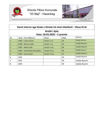 Results and photos of the second round of VIII and IX grade, realized on 18.03.2022 in internal competition in the subject of Chemistry of M.P.S. "25 May". Teachers: Sejdije Bajrami, Rabije Zenuni.