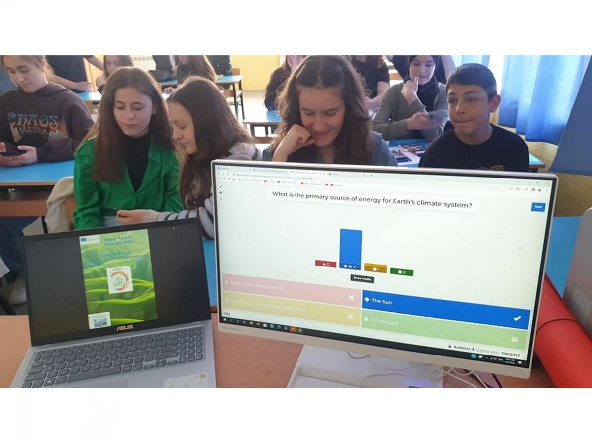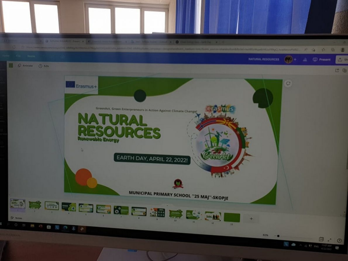 We are pleased to announce you that on 22.04.2022 our school as part of the project "GreenAct, Green Enterpreneurs in Action against Climate Change", project id. 2021-1-NO01-KA220-SCH-000032623, on the occasion of the Earth Day 22, 2022 organized a one-day virtual science workshop.The purpose of this scientific workshop was to get acquainted with climate change, the consequences of climate change and the activities that we as citizens of this society should implement in order to preserve the environment.The students were also presented and introduced with the renewable energy resources. They discussed the issue of consuming energy as well as the advantages of the renewable energy. They were also introduced wth the climate museum which will be introduced in our school as part of the project plan. The activities were prepared and led by the project coordinator Arlinda Kastrati.The presentations were shown through the internet zoom platforms, as well as canva.com, padlet.com, menti.com. We also organized a competition through kahoot.it.