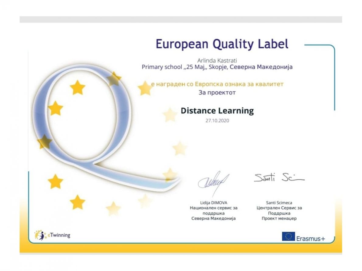 Нашето училиште е наградено со Европска ознака за квалитет за нашата работа во еТвининг проектотот „Distance Learning“, предводено од проф. Арлинда Кастрати, проект координатор. Ова значи дека нашата работа, работата на директорот Фадил Муртезани, нашите ученици и нашето училиште е признаена на највисоко Европско ниво.