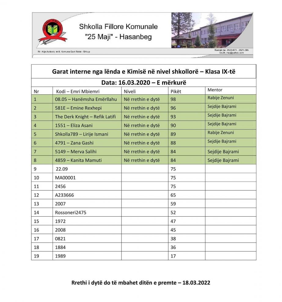 Резултати и фотографии од прв круг од IX одд., реализирани на 16.03.2022 година на интерен натпревар по предметот Хемија на О.О.У. „25 Мај“. Наставници: Рабије Зенуни, Сејдије Бајрами.