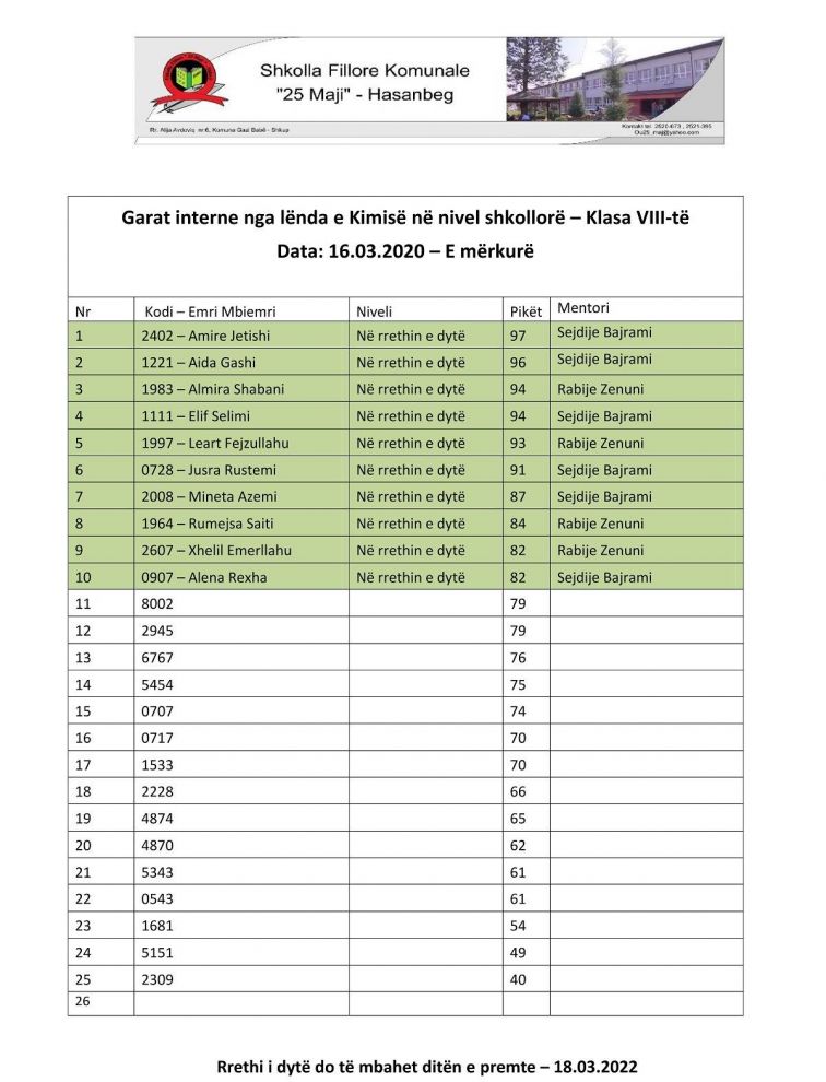 Rezultate dhe fotografi të rrethit të parë të klasave të VIII-ta, tê realizuar me datën 16.03.2022 në garat interne në lëndën e Kimisë të Sh.F.K. “25 Maji“. Mësimdhënës: Rabije Zenuni, Sejdije Bajrami.